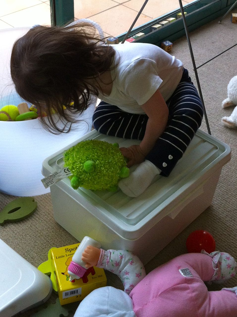And just one last picture for today. Elena has a new trick which stops my heart! She climbs up on a toy box and can’t get herself down…