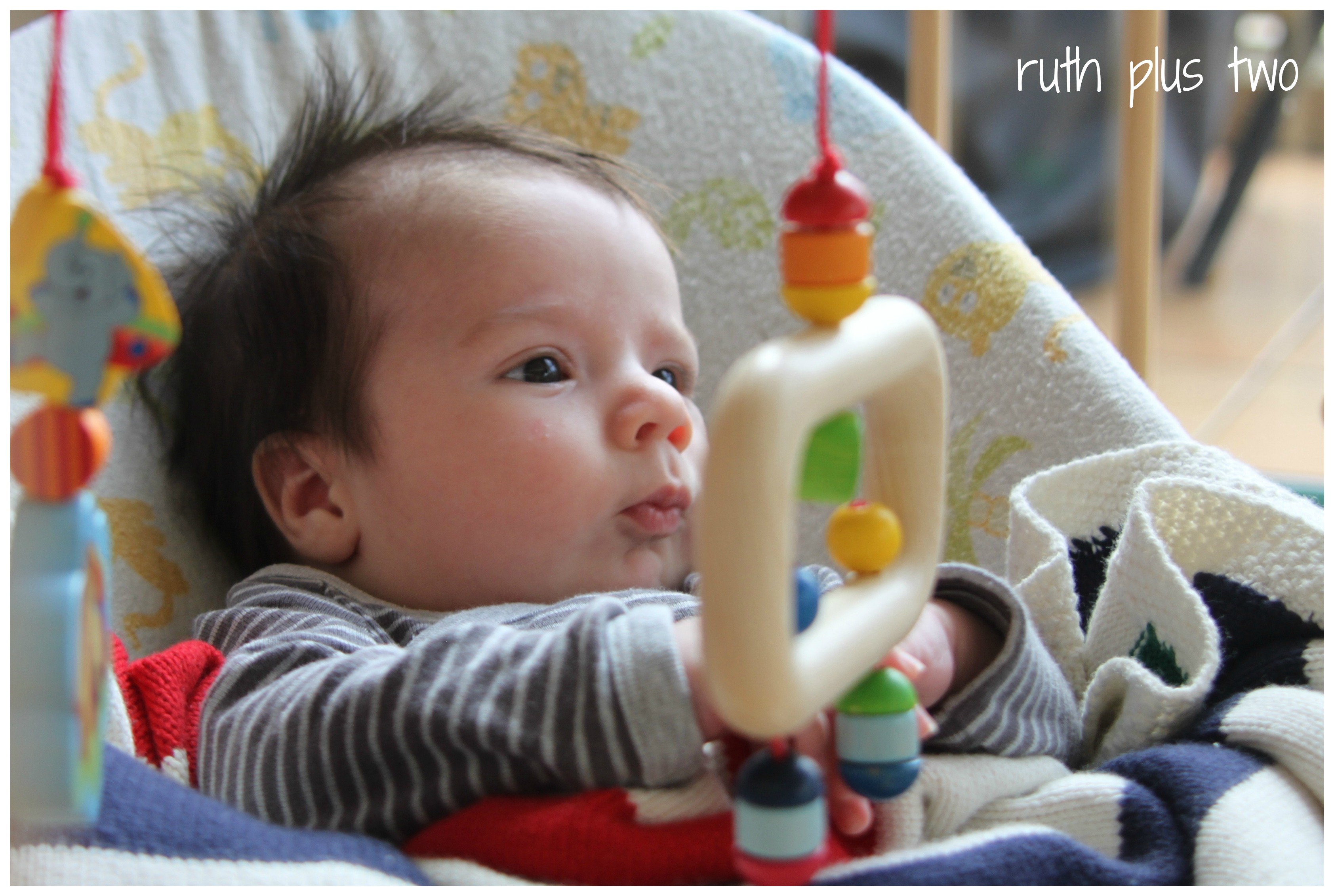 At least Hugo is fine. His biggest concern is keeping his tummy full and working out how to get his hand in contact with the play gym dangling over his bouncer!