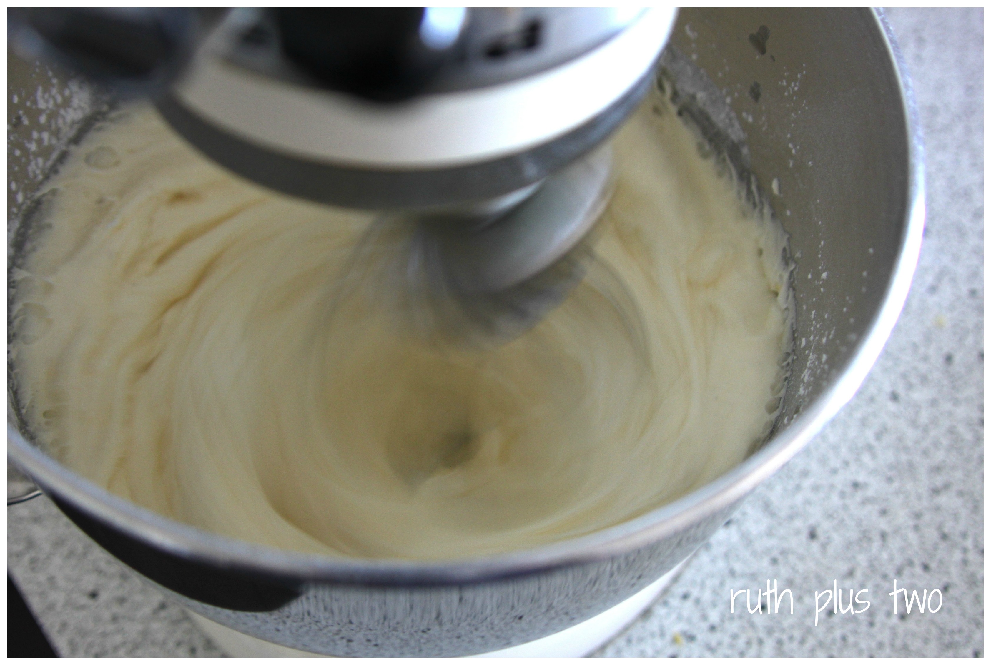 Sift flour and baking powder into the butter mixture and beat on medium speed for 3-4 minutes or until smooth.