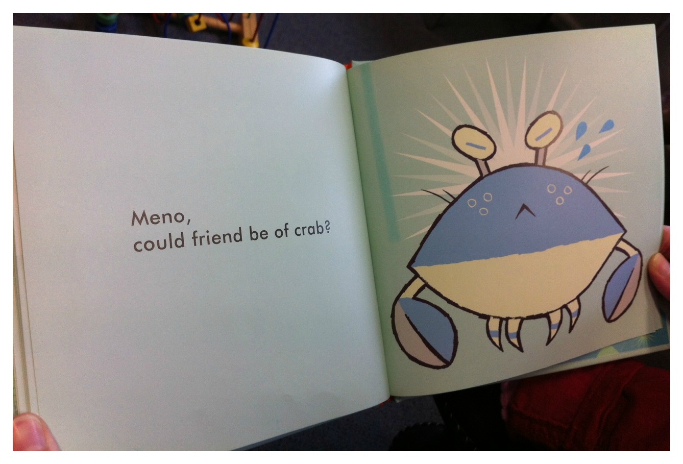 I don’t know about you but sometimes I find things baffle me. Things that are completely and utterly confusing. The latest was this book at the doctor’s surgery this morning. It was all about a little boy called Meno who was looking for a new friend.cover happy fun bowlcrabDavidI’m sure there is some broader joke I’m missing, but seriously: WTF? At least it helped us pass the time.