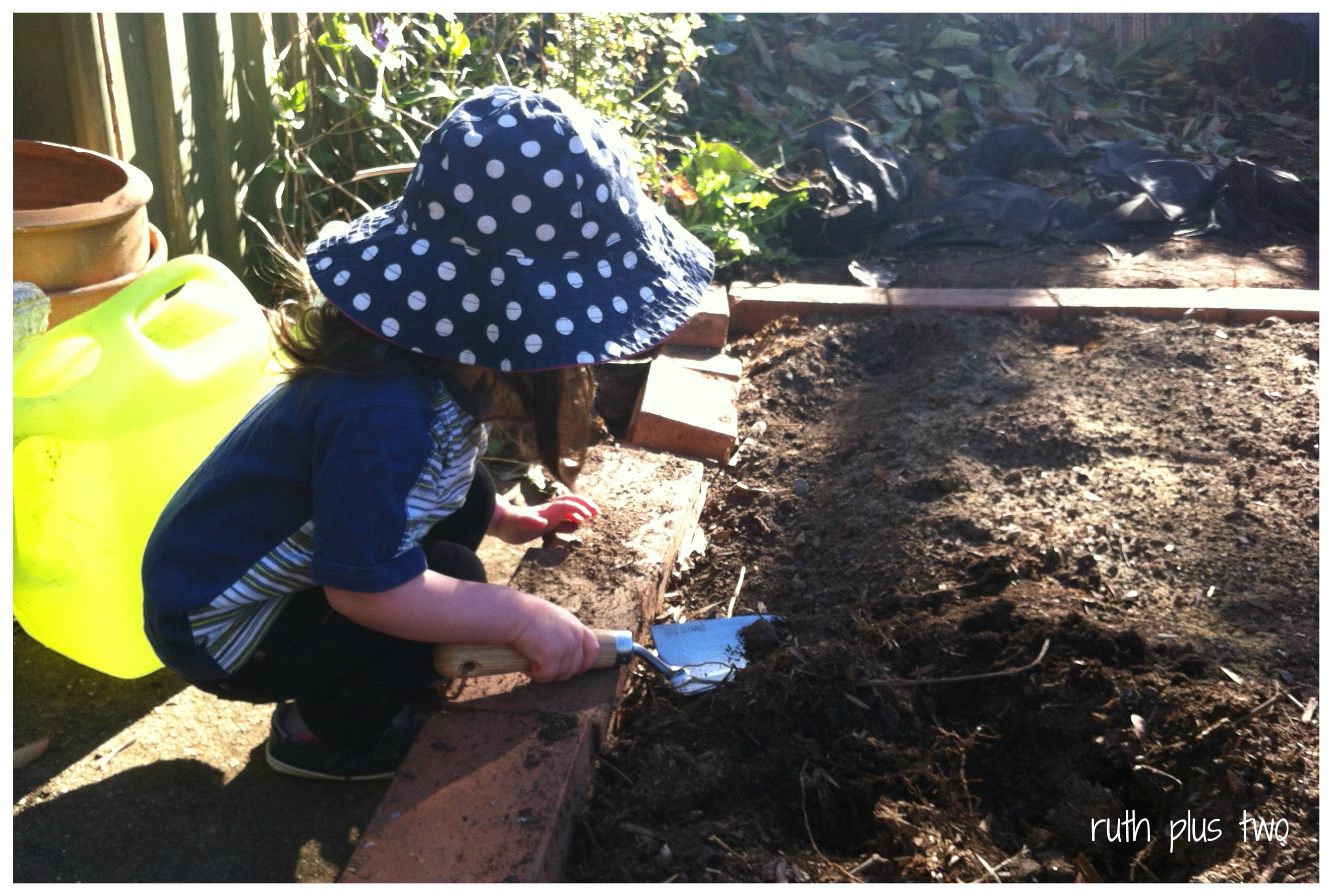 I feel like we’ve ended up with a real mix of plants, but I’m hopeful. We’ve planted out tomatoes, dwarf yellow beans (yellow is Elena’s favourite colour at the moment), Lebanese cucumbers, strawberries, basil and rocket. I’ve also planted some silverbeet and green onion seeds. It’s an ambitious list. There are some little annuals in there too for Elena.