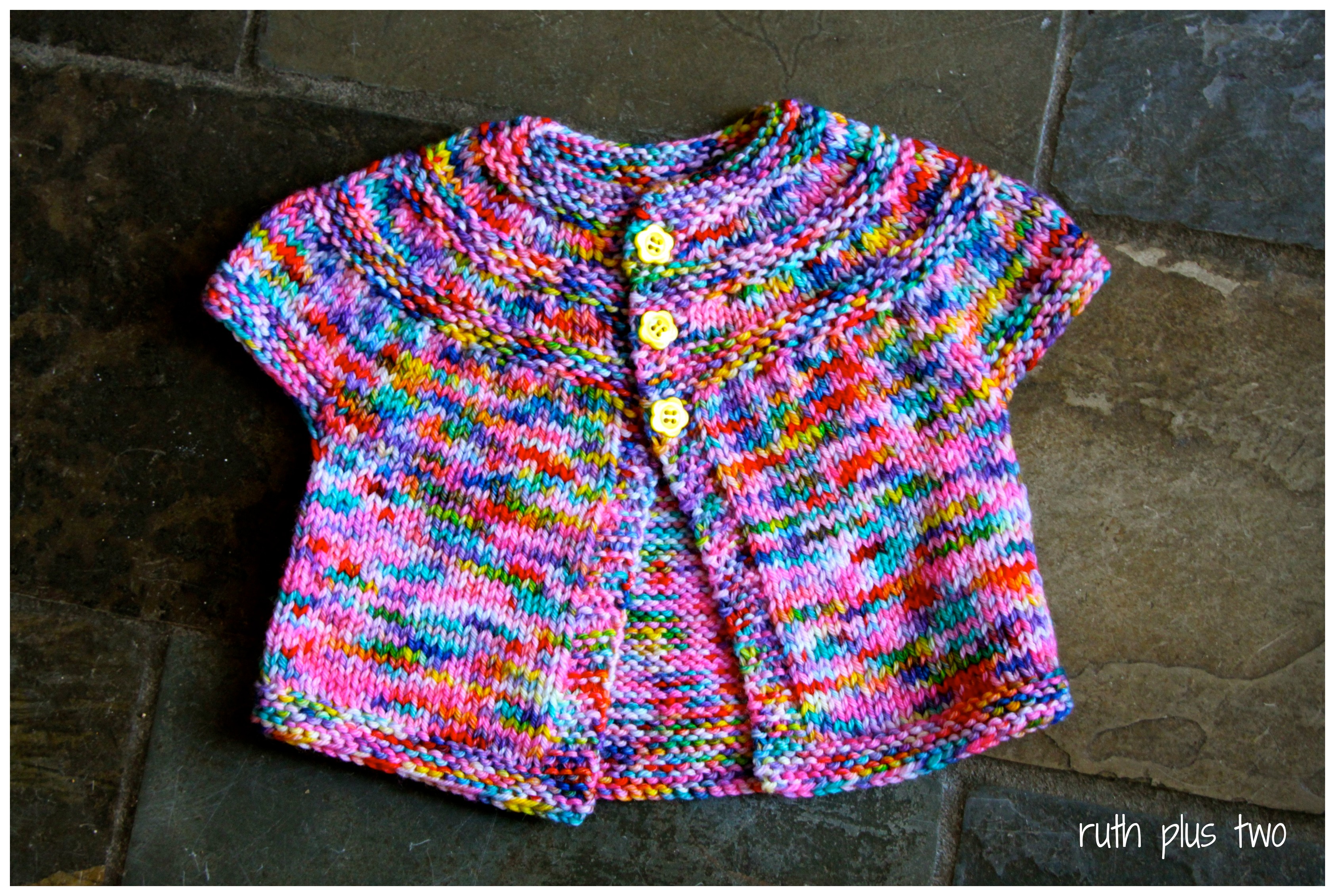 rainbows in threesI knitted what has become my go-to girl knit – another of Kelly Herdrich’s in threes: a baby cardigan. I think I could almost knit one of these without the pattern! This is the 0-6 month size, knitted on 4mm needles to get the required gauge. I had to find some suitably bright buttons. I think these fit the bill.