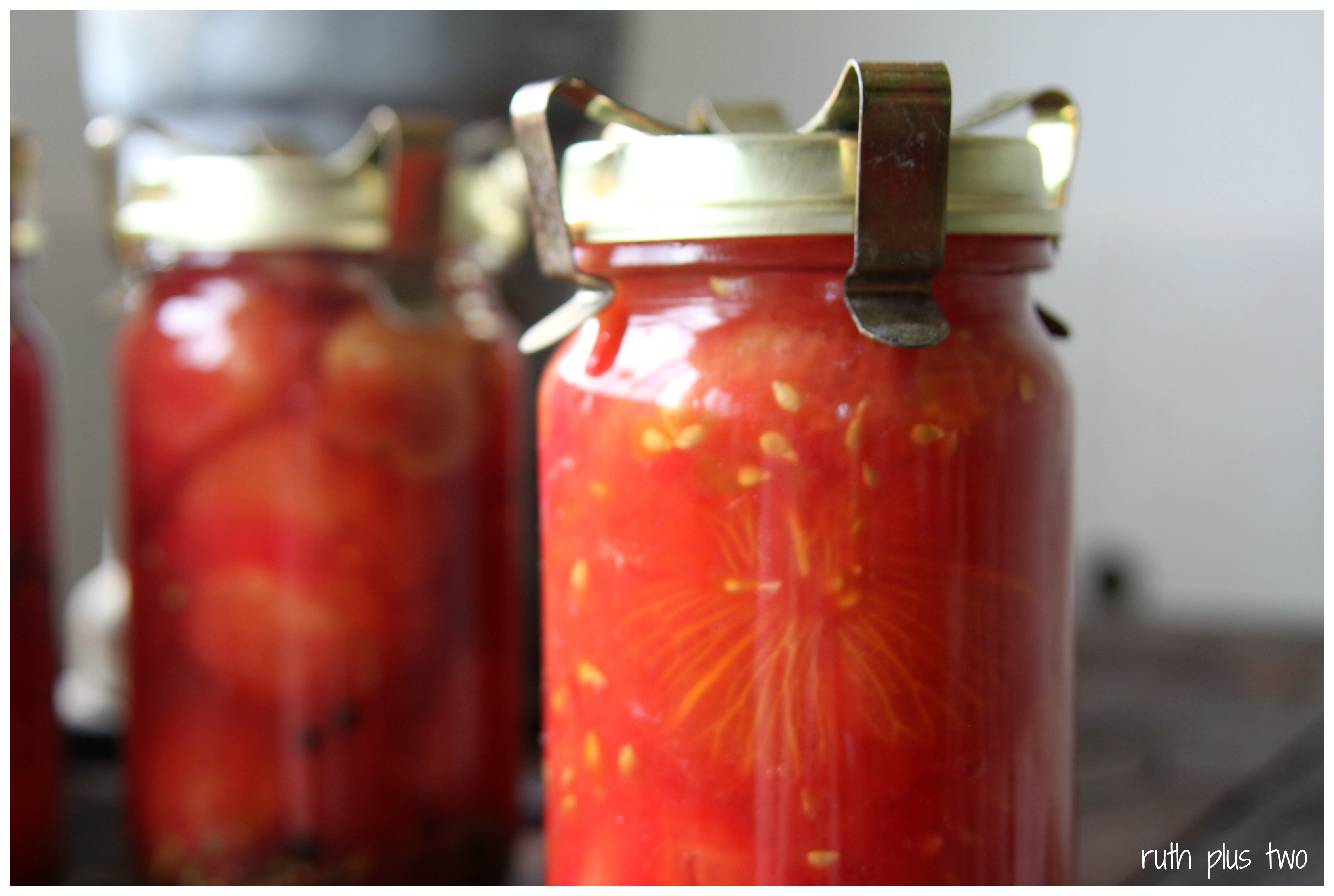 Wow – I just tend to preserve my tomatoes in pasta sauce form by boiling them with whatever herb etc I want and then pureeing them before pouring them into my leftover leggos jars and popping the lid on. I tried removing skins and found it an absolute waste of my time. Have tried some plums – some in wine and some in sugar water so we’ll see what they’re like when I am ready to eat food with flavour again. Your preserving looks much more professional.