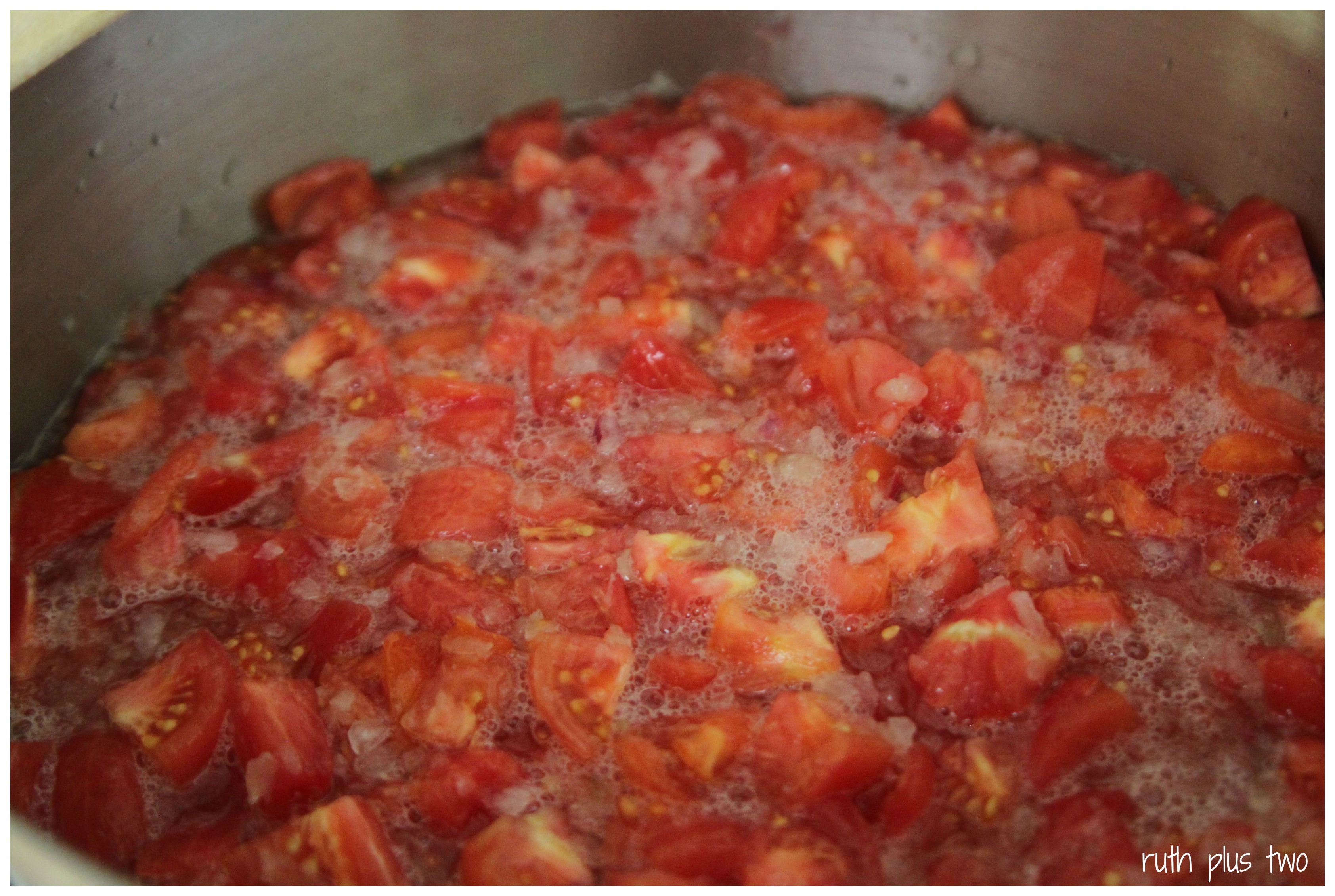 I didn’t have the time to leave the chopped tomatoes and onions sitting overnight, so I reduced the salt to half a cup (and probably could have gone as low as one third of a cup – I suspect a lot of the salt is supposed to be lost when you pour off the liquid) and cooked the mixture down slowly for about three hours.