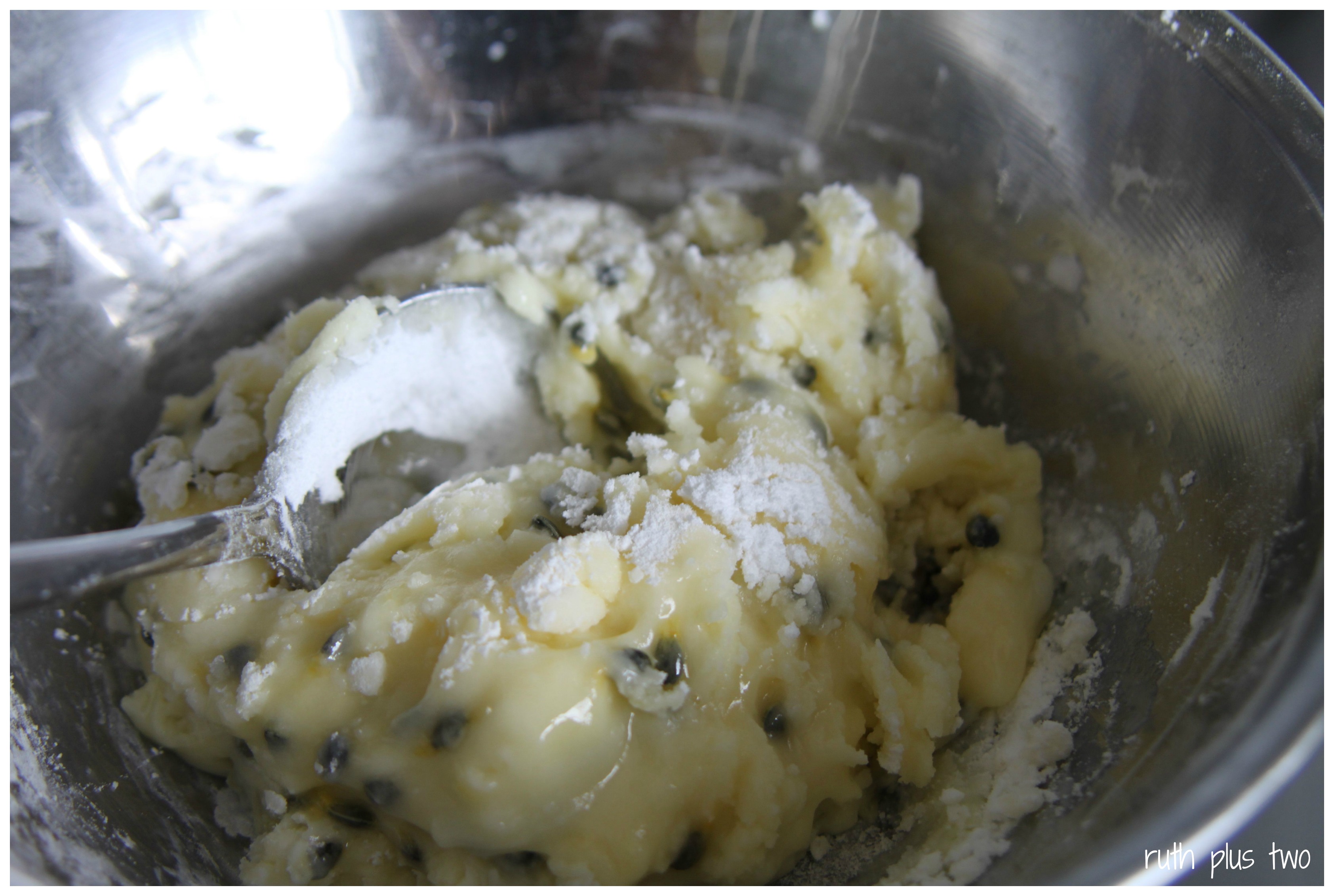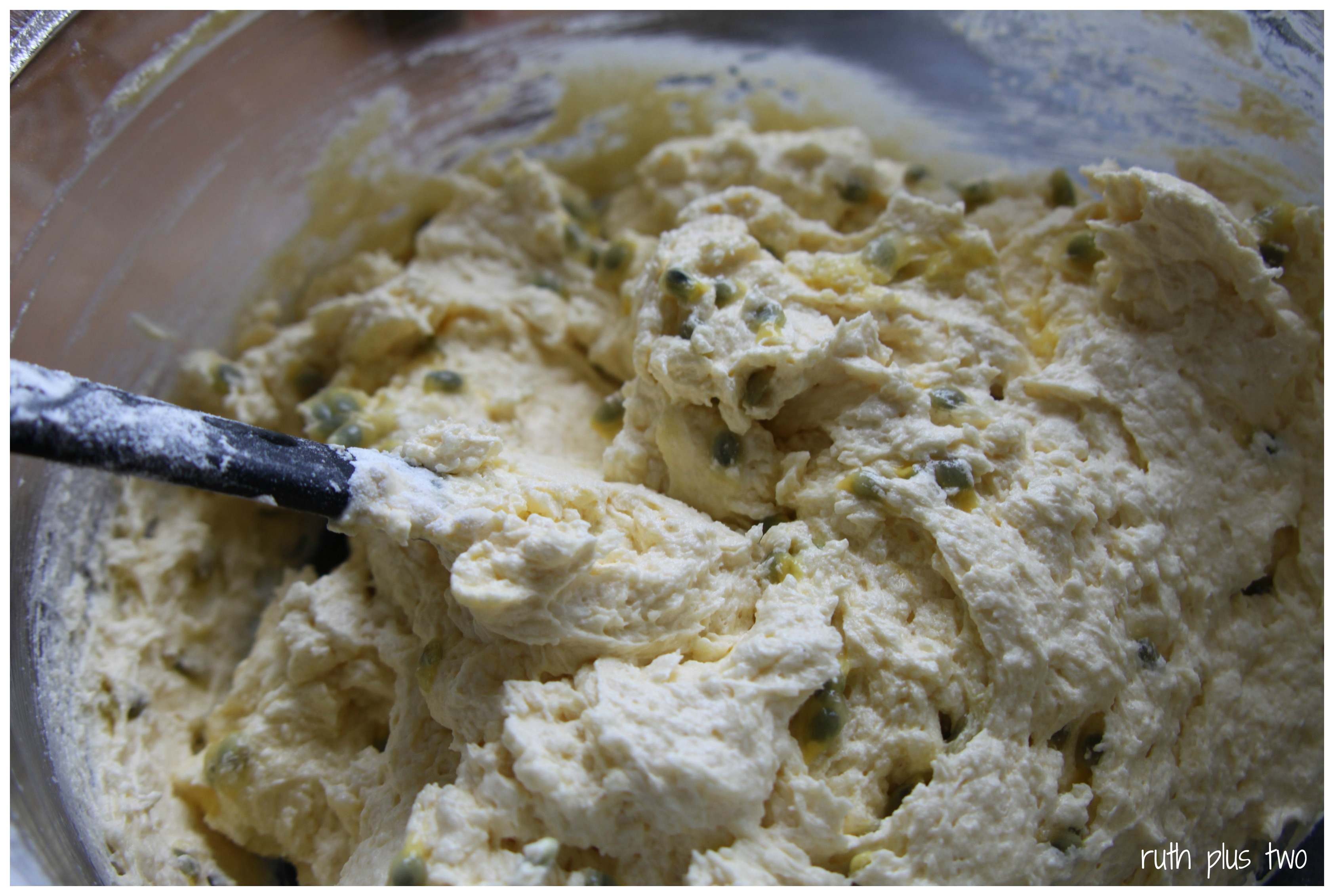 Transfer the mixture to a large bowl, fold in half the sifted flour mixture and half the buttermilk, then fold in remaining flour mixture, buttermilk and passionfruit pulp.