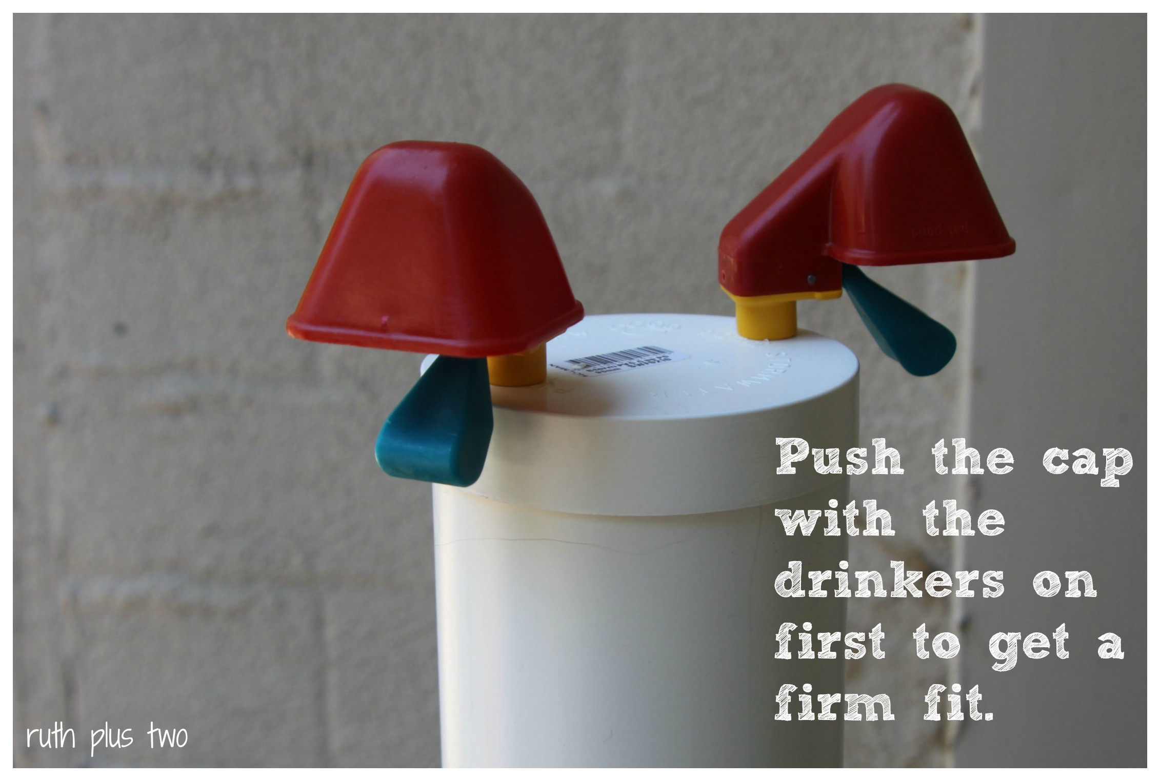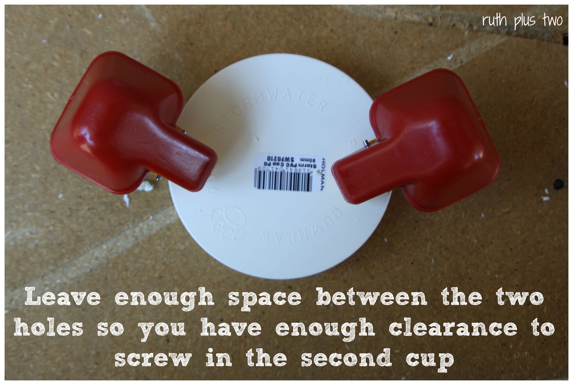 If you want a second drinker cup, work out where to drill your second hole. You need to make sure the holes are far enough apart that you have enough clearance to screw the second cup in (ask me how I know that…let’s just say that the cap on the top of my drinker has two holes in it!).