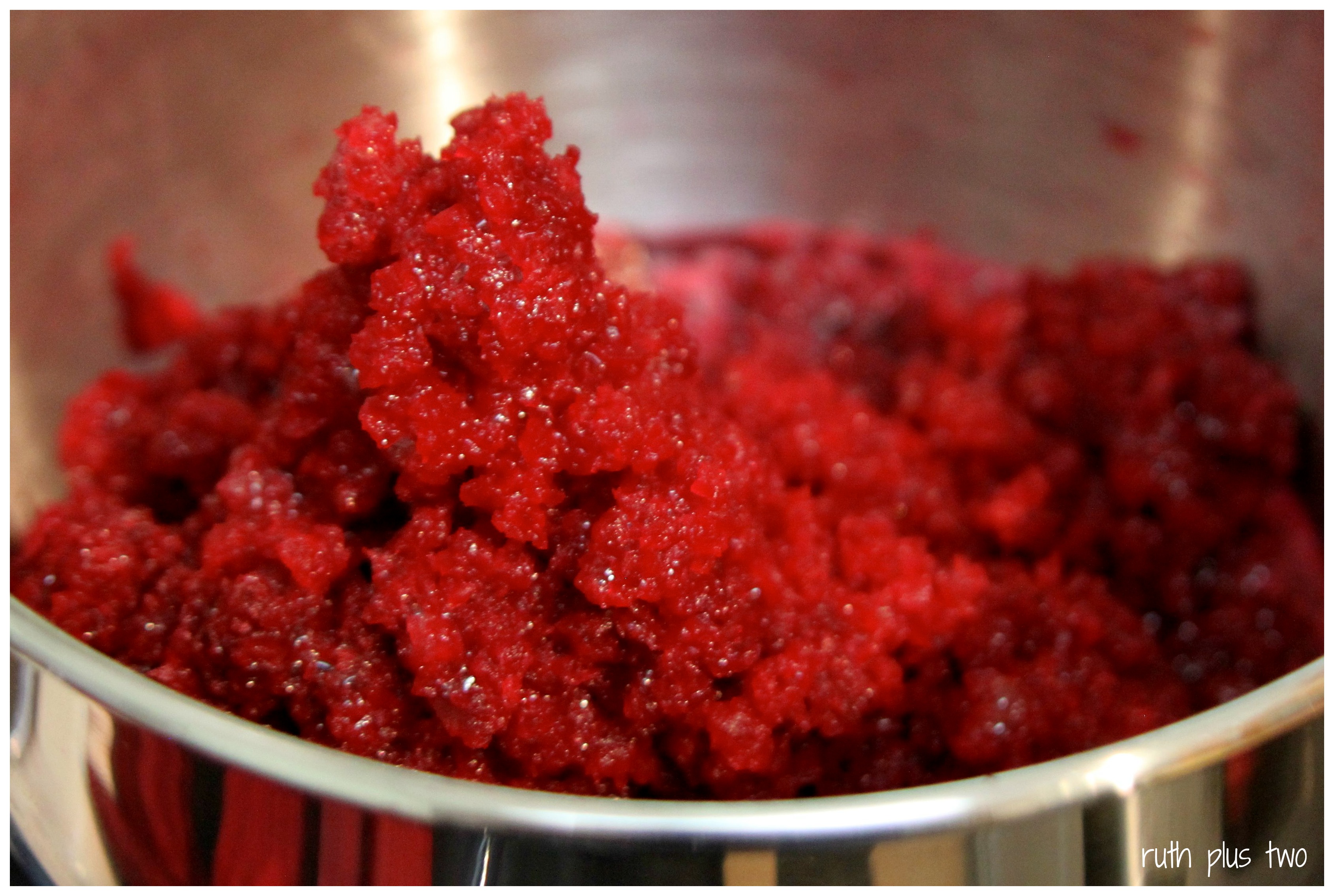 You have a few choices for the way you prepare your beetroot for this relish. You could dice or slice them finely. You could grate them coarsely (very messy if done by hand), or you could run them through a food grinder. I chose a bit of a mix because I like the texture of my relishes to be uneven. I fed two thirds of my beets through my food grinder (at it’s coarsest setting), and chopped the remaining third into matchsticks.