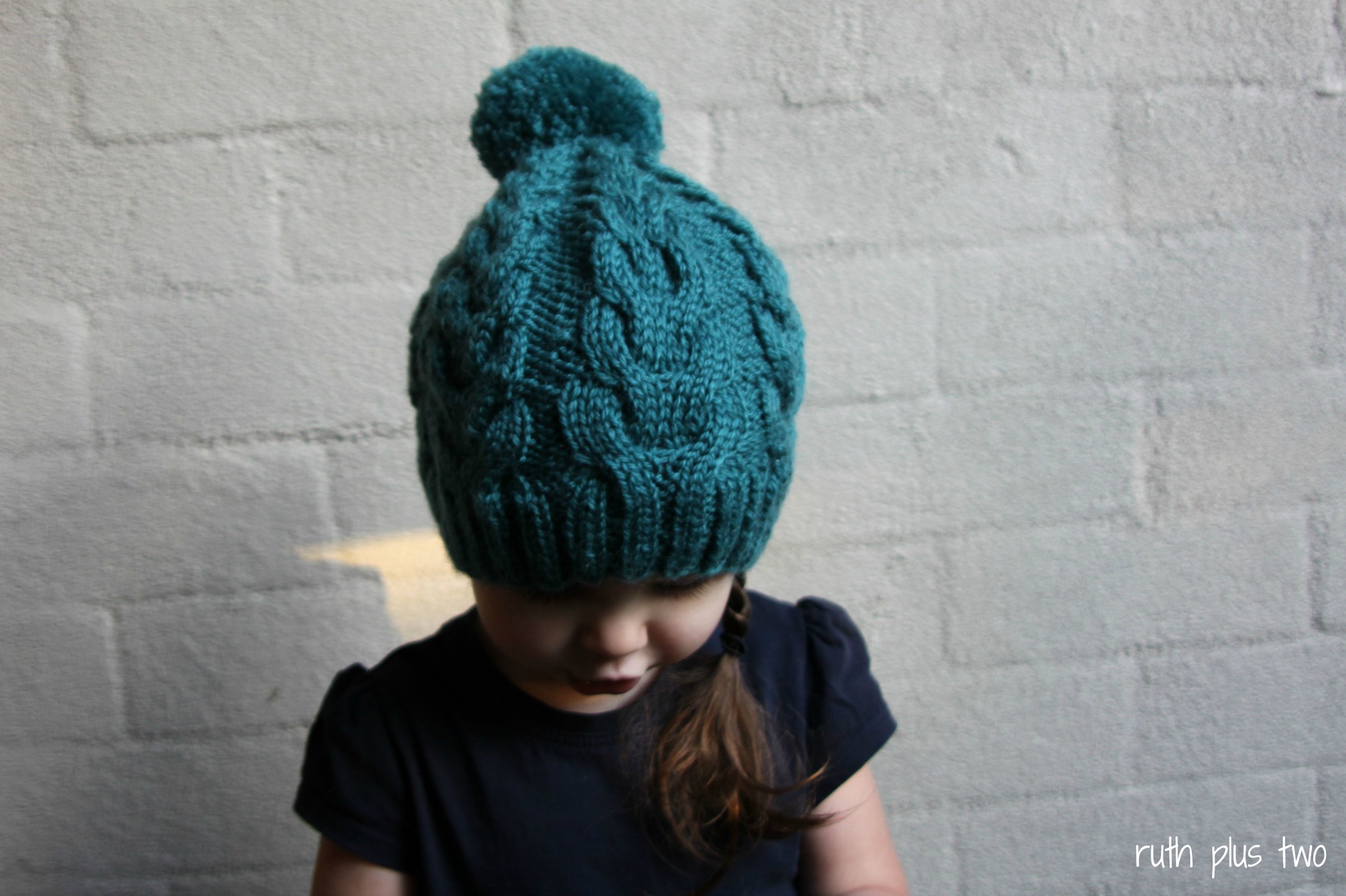 flatElena is pleased to have received a new beanie, and hasn’t noticed one of the cables has gone askew. She adores the pom pom (made using this tutorial). I’m just pleased to have cast it off! I only blocked it gently – I suspect it might respond well to a hard blocking but it is on the big side already and I didn’t want to risk it stretching too much.