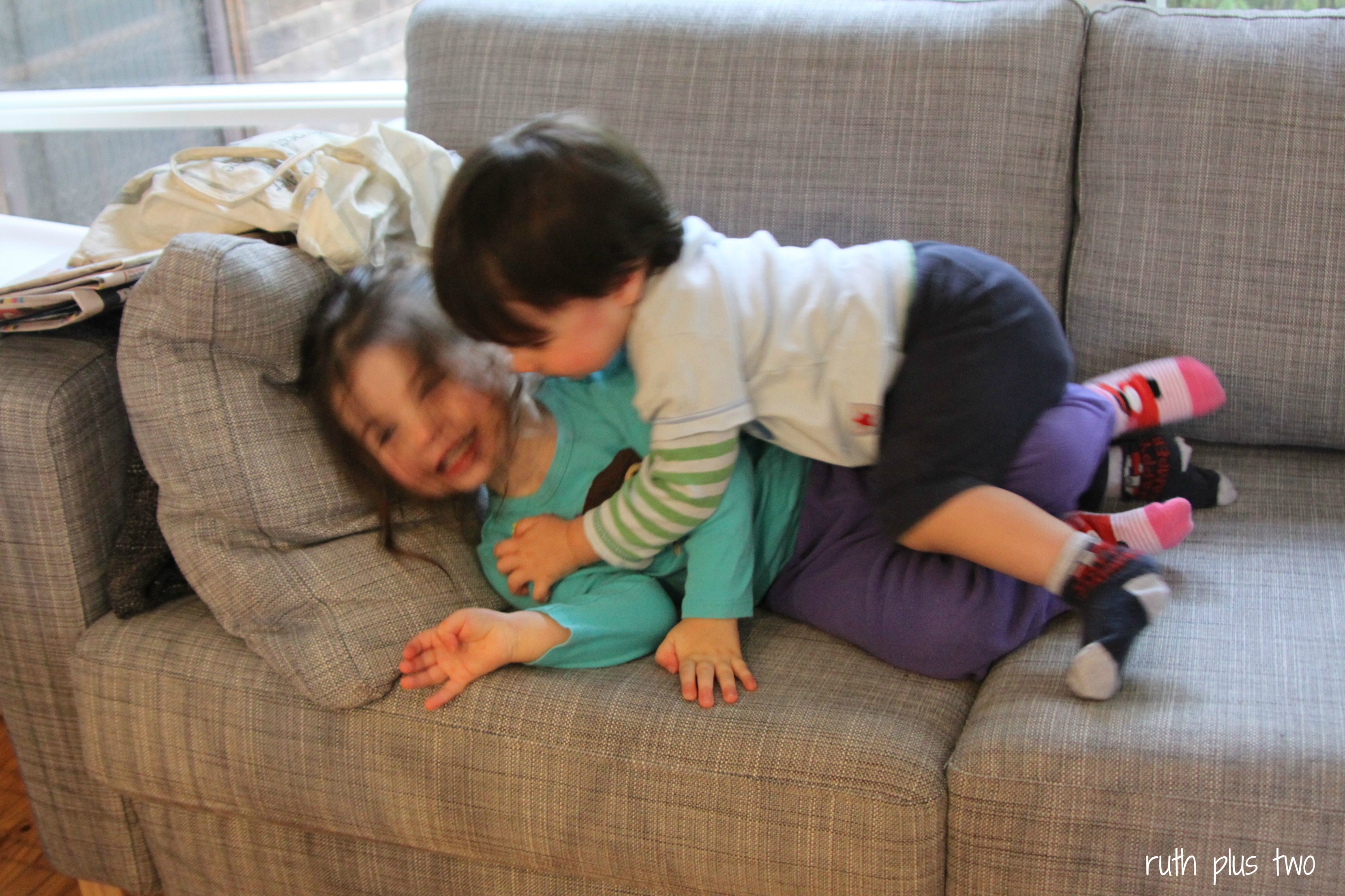 Time for some pictures again. I sewed like mad over the weekend but it was all in aid of some pattern testing so I’ve no photos to share. The rest of the week has been flying – yet again. I’ve been sick, so that’s been a bit ordinary. I got my overlocker and sewing machine serviced. It’s been rainy and dull. Elena’s been picking her favourite colours from the latest Bendigo Woollen Mills shade card. We’ve had the fire on quite a bit. Hugo has discovered how much fun it is to tackle one’s sister. We’ll see how long Elena’s amusement lasts.