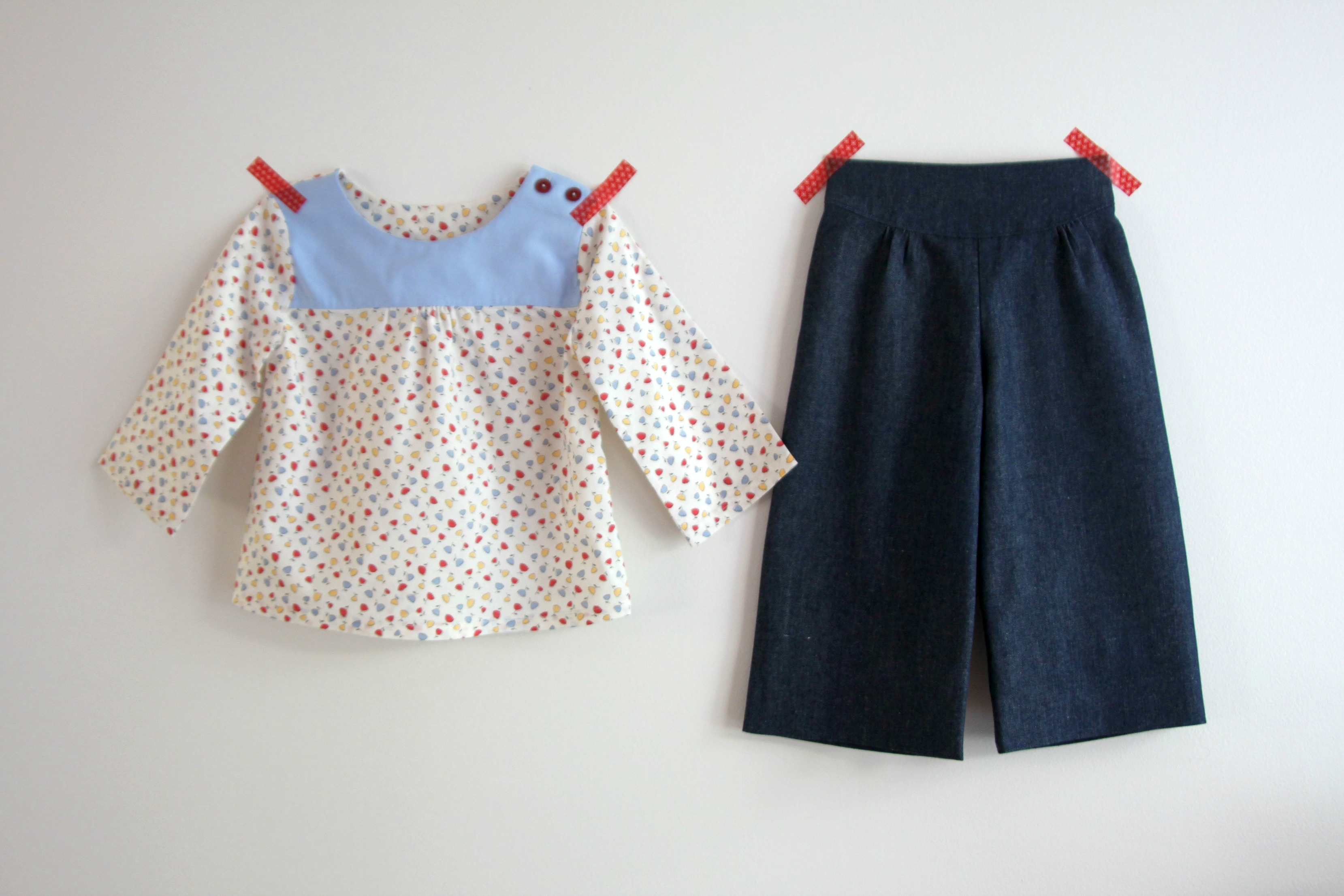 The trouser pattern has lots of neat details – a sweet yoke at the front and flat-felled seam at the back. The elastic is entirely concealed with a clever construction technique which makes the finished product appear professional. The blouse has soft gathers across the chest and buttons on the shoulder.