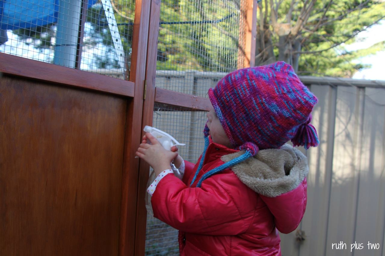 The weather has been so horrible that we’ve just been securing the run with some solid mesh and cable ties each morning and night. Sunny weather had us off to buy some timber on Saturday morning, only to find out that the store (Bunnings Tuggeranong, if anyone local is wondering) is expanding their DIY education program…Score!