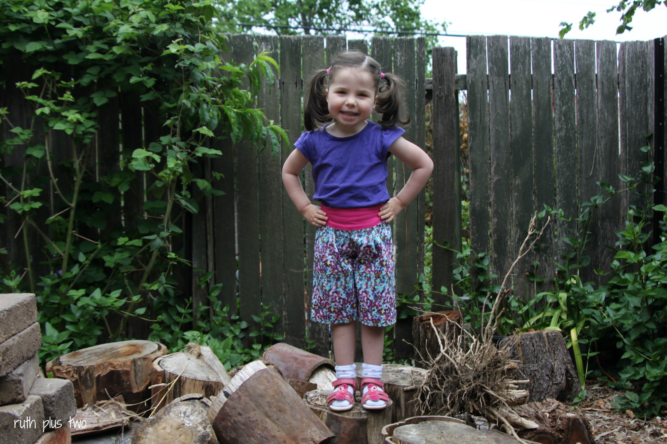 The shorts are sewn from a stretch drill. I didn’t realise it was stretchy until I had washed it so pressed on with fingers crossed. The front of the waistband is sewn from non-stretchy chino drill for a bit more stability. And some pink. I sewed a size 2T for my tiny girl, with size 3 length.